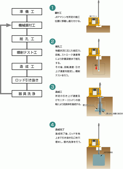 JEP工法は、超高圧ジェットの持つ運動エネルギーによって、地盤の骨格構造を破壊し、エアリフト効果によりその破壊された土粒子の大部分を地上へ排出すると同時に、残留した土粒子と硬化材が混合され、大口径で高品質な改良体を造成する工法です。